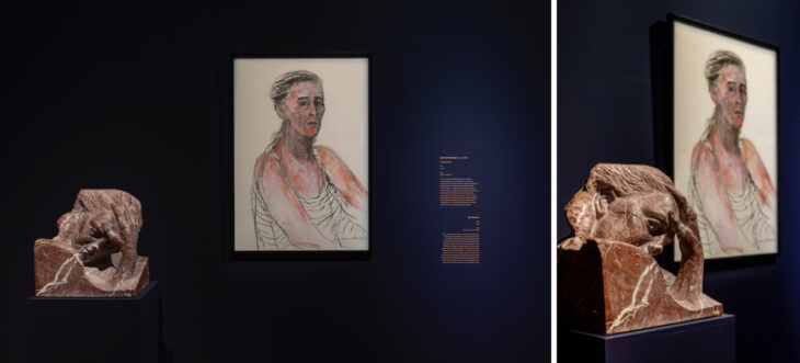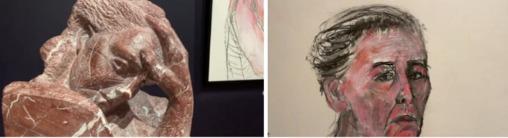 主に彫刻家として仕事する彼女の作品の一つは、アルバニアの赤い大理石を使用して卓越した造形力があります。彼女の神妙な面持ちとポーズをする彼女は、皮膚のシワや自身の不安な表情などを飾ることなく表しています。