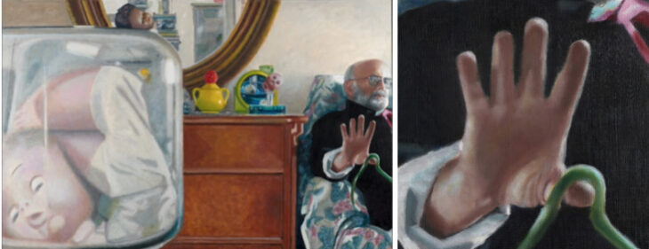Jarosław Modzelewski の作品は、この展示作家達の中で最も肖像画らしいと言えるでしょう。ヤロスラフ モジュリウスキーは自身のスタジオ内での状況を描いたもので、なんとキャンバスにテンペ技法が使われている個展絵画の手法です。彼にとって、作家の仕事はコンセプトやビジョンのみならず、手仕事とその職人的仕事量にあると言います。