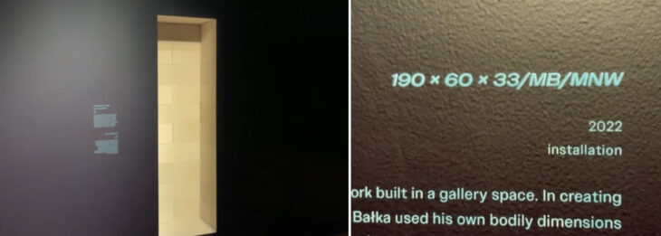 美術館に開けられた四角い穴は、Mirosław Bałkaによるポートレートで、ミロスラフ・バルカは自分の大きさを測り、タイトルは穴部分の大きさになっています。これにより、不在の在を表現しています。
