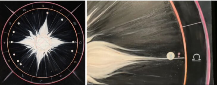 こちらは、Agnieszka Brzeżańskaで、こちらも作家自身を宇宙的な図表の中に潜ませる作品です。近くで観ると、様々な記号や彼女が生まれた日の星の位置が記されています。宇宙学や形而上学から参照される彼女の作品は、何も説明がなく見るのと、このような説明がありこの作品を見るのでは違った印象を持つことかと思います。