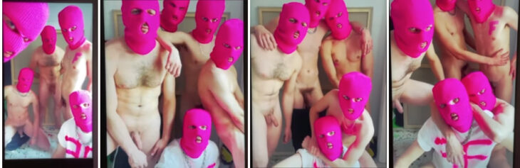 次は少し矛盾を生むかもしれない作品です。Karol Radziszewskiでこちらはデジタル画面がループして動いています。カロルはシャツを着ている人物で、また皆が被っているピンクの仮面は、彼のおばあちゃんがつくったものだとのことです。こちらは2007年から続く長い「Fag Fighter」プロジェクトで、ホモセクシャルをオープンにし、社会のスティグマに立ち向かっています。裸体という意味でも人体像のポートレートとして成立しています。