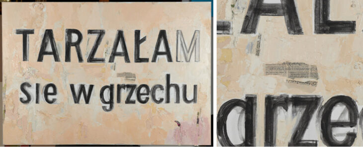 Jadwiga Sawickaの絵画は、ポーランド語で書かれたもので、彼女はセンテンス、ワード、詩のようなものを多用します。 「Tarzalam sie w grzechu」(=私は罪に溺れた)ですが、Mが透明感があり、Mがないと「私」ではなく、「彼女は罪に溺れた」となります。彼女が言うには、「女性は社会や政治によってモラルを教えられるべきではない」と述べています。この油絵は厚く塗られており、また新聞や雑誌なのどの切れ端でコラージュされています。
