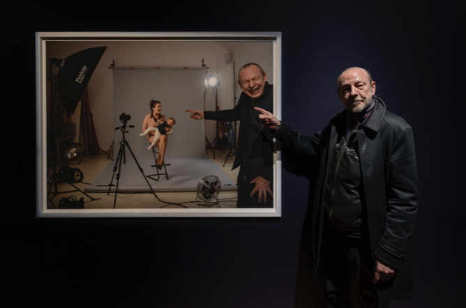 Zbigniew Liberaの写真作品です。右で指をさしているリベラの先には赤ん坊時代のリベラがいるという仕掛けがあります。泣いている彼を抱える母親には吸血鬼の歯があり、彼が幼少期の写真嫌いを物語っています。