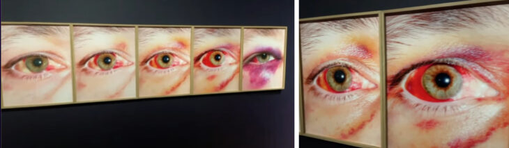Rafał Milachも写真作品を提示します。彼はMagnumの唯一のポーランド人メンバーでもある写真家です。この写真は、彼がデモに参加した際に殴られ、その傷ついた目が治っていくプロセスを撮影したものです。本や文字など、左から右に時間軸が流れるポーランドでは、徐々に目が治っていくのではなく悪化しているように仕向けて民主主義と右翼との戦いについて表現しています。