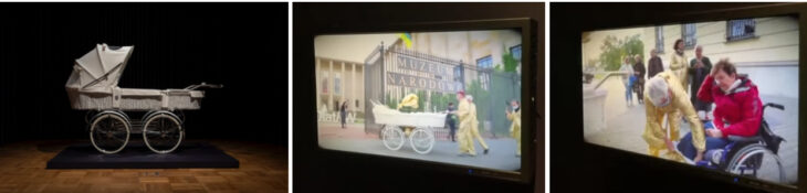 彫刻家、Paweł Althamerは、大人が入れるサイズの乳母車をモチーフにしています。これは他者との関わりの中で自己が存在できることを意味しています。彼はクリエイティブとプロセスに強いこだわりを持っています。同時に乳母車をモチーフに人間の生から死へのメタファーとも言えるでしょう。彼はNowolipieグループの一員として、多発性硬化症に苦しむ障害のある人たちと共に写真右のようにワルシャワの公共の場で歩きパフォーマンスをしている姿です。