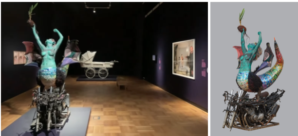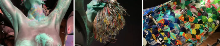 そして首元には、七色に光る海洋に浮かぶ油を模したものも描かれていて、水面化の悲惨な状況を表しています。髪の毛は電気ケーブル、尻尾空き缶、台座はバイクのスクラップなどのリサイクルされたゴミで作られています。しかし、このマーメードは諦めることなく戦っているように見受けられます。このようにセルフポートレートを通して社会に重要な問題を投げかけているのです。