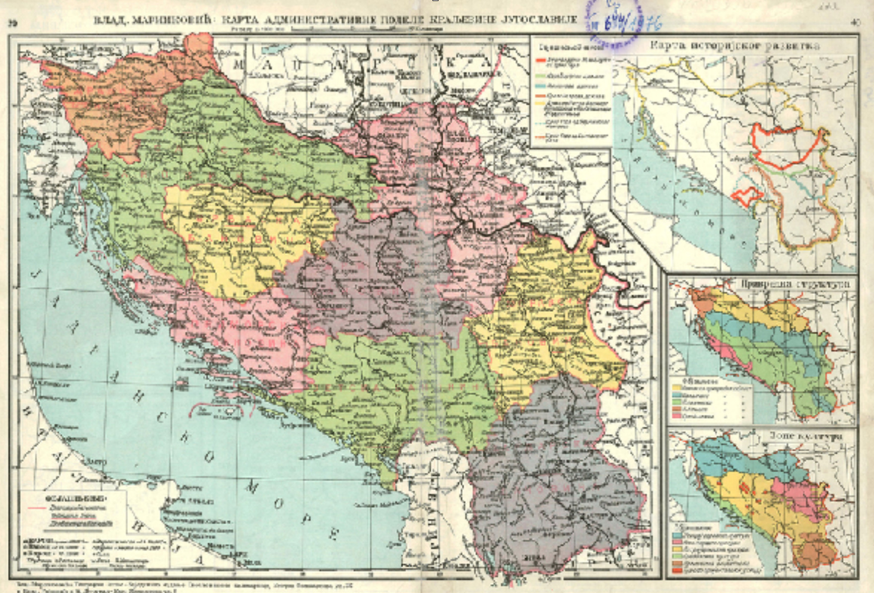 こちらは、古いユーゴスラビア王国時代の地図です。色の違いは、河川の名に由来した、行政区間の違いです。ユーゴスラビアは国粋主義にはならないように構成されています。理由は、異なる民族、文化、国籍、宗教が混在しているからです。 北にはスロベニア、中央にはクロアチア、セルビア、南にはマケドニアやモンテネグロがあります。ボスニアは、それらともまた異なる文化があります。ですので、様々な国籍や文化の違う多くの人が、 同じエリアで、 大体似たような同じ言語を共有しているのです。