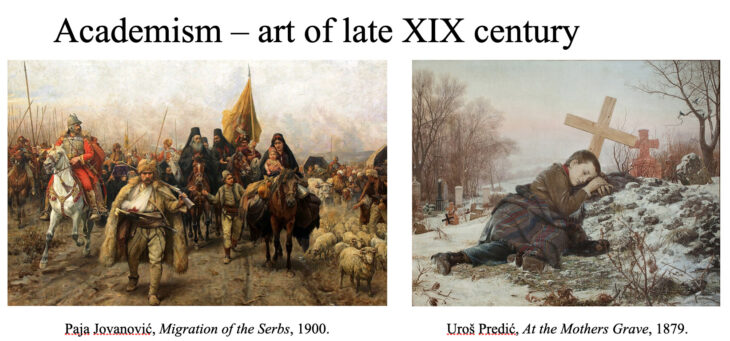 では、ユーゴスラビア設立前の、19世紀後期芸術の傾向はどんなものだったのか。絵画や彫刻などのファインアートは、当時オスマン帝国ではなく、オーストリア・ハンガリー帝国側では重要視されていたので、この地域の芸術趣向は西ヨーロッパ的でした。 ウィーンやミュンヘンに留学をする若者もいました。このように、アカデミックな芸術を勉強した芸術家は、歴史的価値観を紐付け、国事主題などをコンセプトやモチーフにし歴史的絵画などを残していきました。最も有名な画家の一人、Paja Jovanovićは、戦争、移民の生活を描き、沢山のコミッションワークがあったアーティストです。パヤ・ジョヴァノヴィッチは、1960年代までこのスタイルを続けた古典画家といえます。その他の作家でも政治、市民や農民の生活、ポートレートや風景画など、西ヨーロッパで流行したものは基本的に19世紀後期ユーゴスラビアでも見られました。