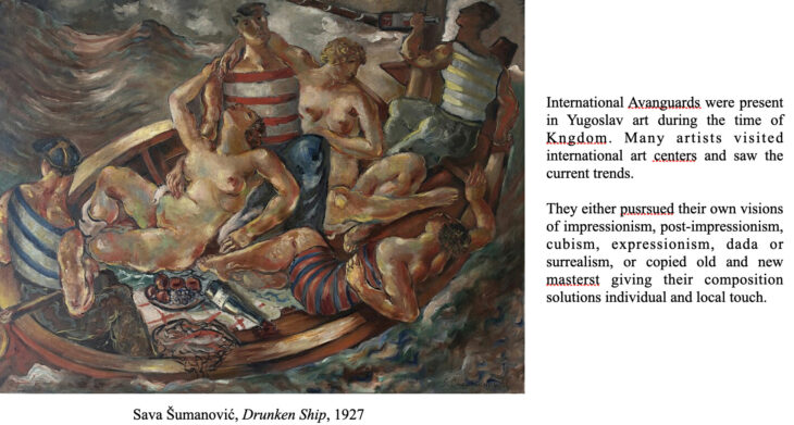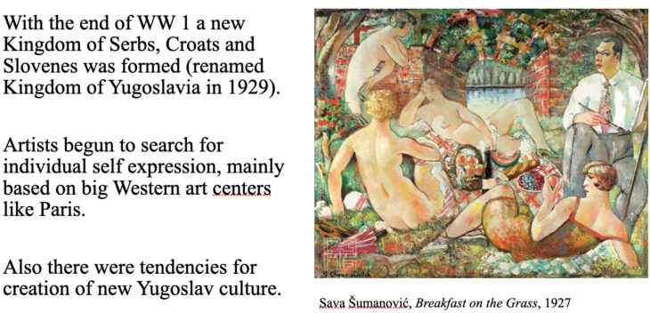 Sava Šumanovićもその一人で、ユーゴスラビア王国時代は多くの作家が表現主義、キュビズム、ダダやシュールレアリズムなど、自分達の解釈で様々なインスピレーションを取り入れていきました。
