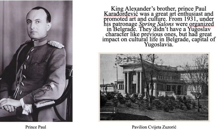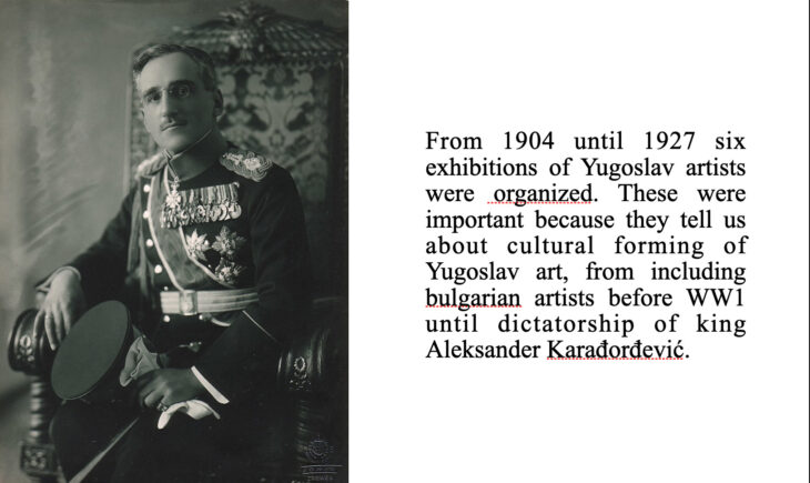 1904年から1927年までには、彼の力により、ユーゴスラビアのアーティストについての6つの重要な展示会が開催されました。これはユーゴスラビア美術の構築という文脈においてとても需要なものでした。この写真のKing Aleksander Laradordevicはユーゴスラビア初代王のKing Peterの息子です。彼の振る舞いはプロのユーゴスラビア人であリセルビア人であり、ババリア出身の人と言えます。ユーゴスラビア国家アイデンティティーを形成することに熱心で、そこから独裁的な政治の指揮をとるのですが、ともあれ、彼こそがアートの力を理解している人物でした。