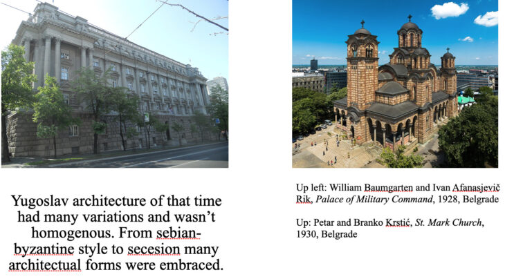ユーゴスラビア形成前の建築は、ルネサンスやバロック様式もありましたが、セルビア地域では中世時代はビザンチンと関わりがあったので、ネオビザンチン様式や、セセッションスタイルなど、様式はあまり均一化せず多様な建築がありました。また移民のロシア人に建築されたものも多く残っています