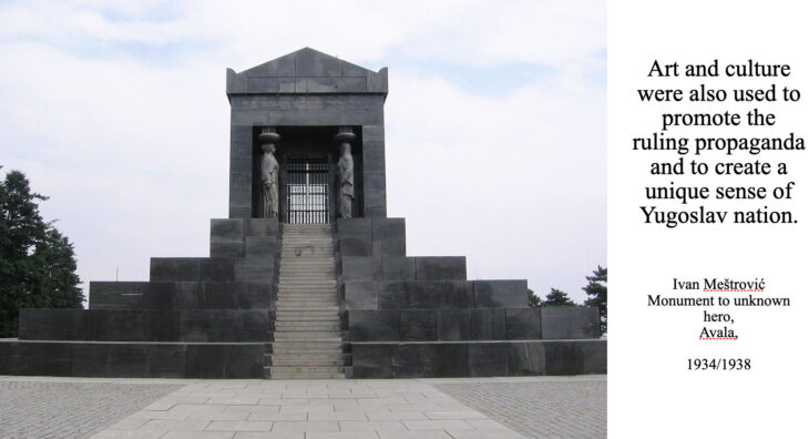 これらのように、15世紀からのオスマントルコ帝国やハンガリー帝国に対しての戦いや、王家を英雄にしたり無名の戦士をヒーローにして、巧みにユーゴスラビア国家を芸術の力を援用して築いていきました。