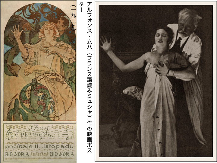 チェコ出身のポスター画家、アルフォンス・ミュッシャは実は映画ポスターもつくっていたのです。写真は彼が制作した映画ポスターとそのためのモデルのポーズを決めている写真です。元々ミュシャは、劇場のいわゆる書き割り、セットの絵を描く人なので、画壇の人から見れば非常に低く見られていた時期があります。ご存知のように、ミュシャはフランスに行き、 そこで、サラ・ベルナールという大変有名な女優に認められ、そこで一夜にしてトップ画家になりました。