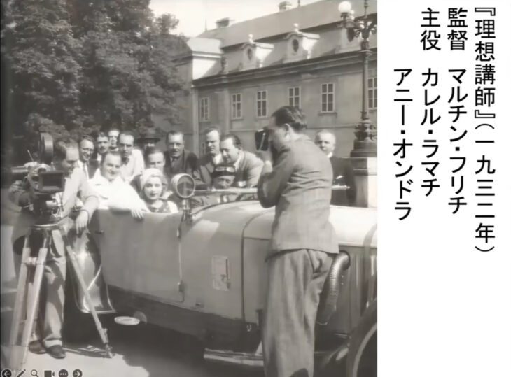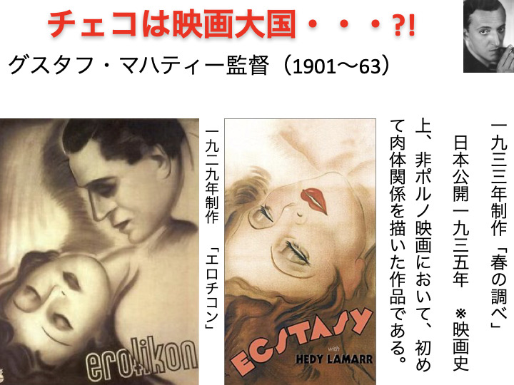 次に、チェコは実は映画大国という言い方もあります。実は映画の無声時代に無声映画をチェコスロヴァキアは沢山作っています。これは有名な話なのですが、特にGustav Machatýという監督が、彼が次から次へと、とんでもない映画を作っていきました。1929年に、このErotikon という映画、 それから1933に年も、非常に日本でも話題になりました Ekstaseという映画を彼が撮るわけです。実はこの映画は、映画史上、初めて肉体関係を描いた作品として知られています。