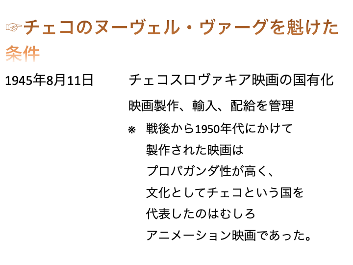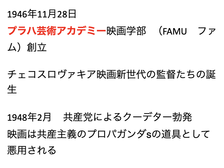 もう一つ付け加える内容に、1946年に、プラハ芸術アカデミーの映画学部(FAMU)といって、映画を大学レベルで勉強できるというのは世界的で見て非常に早かった大学がありました。戦後の世代は、そこでチェコスロバキア映画新世代というふうに呼ばれ、そこから後のチェコのヌーベルワーグの人たちがリクルートされていくわけなのです。 しかし先ほど申し上げましたように、 48年の共産党によるクーデターが勃発し、プロパガンダ映画が作られます。それで当時まで国民的大スターという人たちはステータスを失う人たちが多く出たのです。