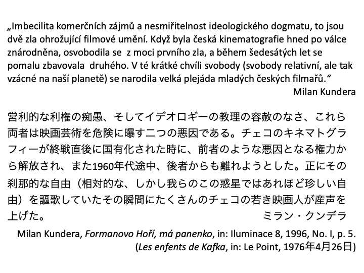 例えばこれは作家のミラン・クンデラの有名な言葉ですが「営利的な利権の痴愚、そしてイデオロギーの教理の容赦のなさ、これら両者は映画芸術を危険に曝す二つの悪因である。チェコのキネマトグラフィーが終戦直後に国有化された時に、前者のような悪因となる権力から解放され、また1960年代途中、後者からも離れようとした。正にその刹那的な自由(相対的な、しかし我らのこの惑星ではあれほど珍しい自由)を謳歌していたその瞬間にたくさんのチェコの若き映画人が産声を上げた。」と述べています。