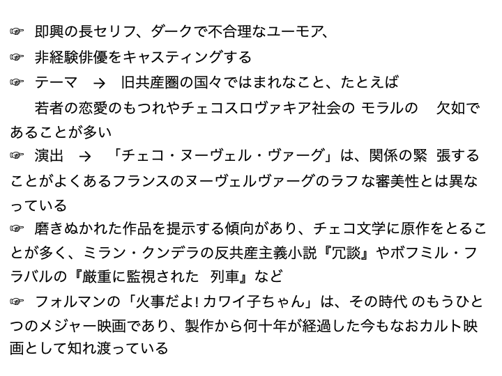 では、改めて、ヌーヴェルバーグというのは何かというと、これはおそらくチェコだけではなく、例えばフランス、 イタリア、当時の日本でもそうですが、「即興の長セリフ、ダークで不合理なユーモア」「非経験俳優をキャスティングする」、旧共産圏の国々では稀な表現で「若者の恋愛のもつれ」などの、モラルの欠如のようなことが多くありました。演出においてチェコ・ヌーヴェル・ヴァーグでは、多くの映画は文学の原作があり、それに基づいて作られています。