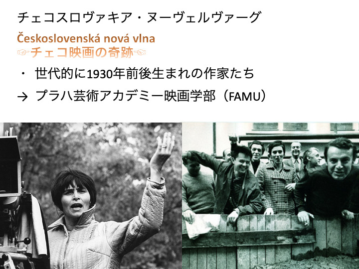 以下ホリー氏):よろしくお願いいたします。本日は、日本であまり知られていない「チェコ映画」についてお話しさせていただければと思います。「チェコスロヴァキア・ヌーヴェルヴァーグ」という言葉は 皆さんにとって馴染みがないかもしれません。ヌーベルバーグというと、やはりフランスやイギリス、イタリアなどが知られていますが、実は1960年代には色々な国でヌーヴェルヴァーグ運動というものがありました。日本でも例えば、勅使河原宏新藤兼人などの「日本ヌーヴェルヴァーグ」 が知られています。それでは歴史を遡り見ていきましょう。