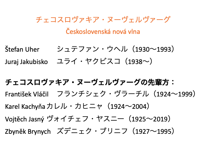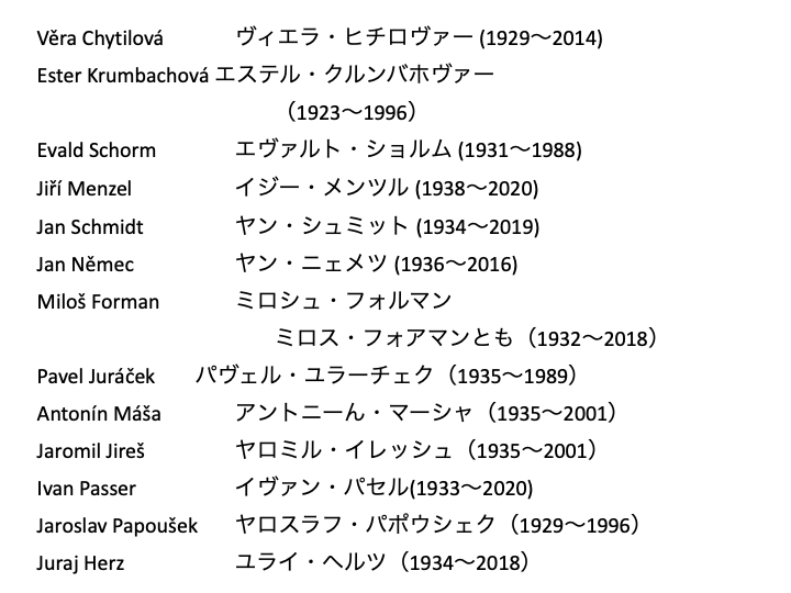 先ほどの世代で、映画史に名を残した監督たちの一部です。日本での知名度からいけば、おそらく一番有名なのは『ひなぎく』のヴィェラ・ヒチロヴァー監督でしょう。ヤン・ニェメツやイジー・メンツルの映画も1960年代に日本で紹介されています。