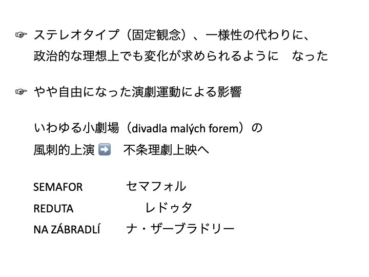 1960年代は、映画だけではなく、いわゆる「演劇運動」、特に「小劇場運動」というのがありました。つまり、演劇が映画に何らかの影響を及ぼすというのがあるわけなのです。ですから非常に風刺的であったり、チェコの場合は不条理劇というのが映画になったりしました。 チェコだと例えばSEMAFORREDUTANA ZÁBRADLÍという劇場があり、今も現役の劇場になっています。
