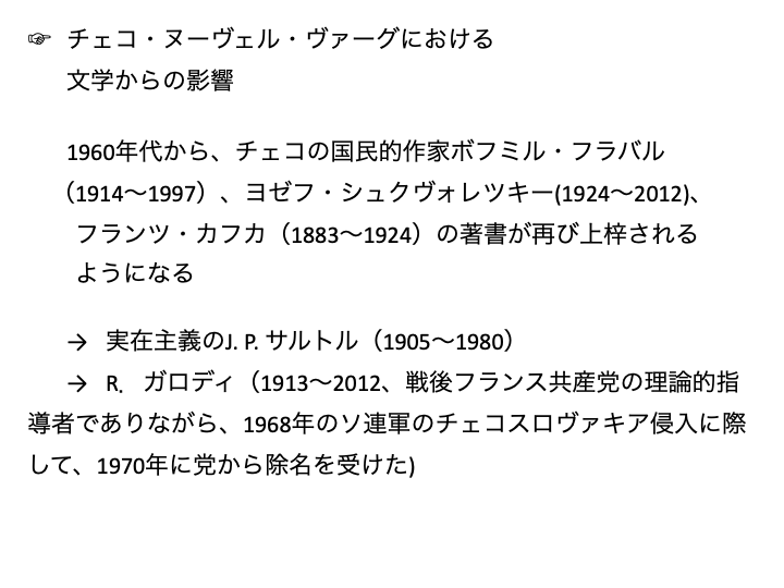 先ほど申し上げましたチェコ・ヌベルバーグにとって、文学からの影響というのは非常に大きいわけです。 例えばBohumil HrabalJosef Škvoreckýです。もちろん、フランツ・カフカもプラハ生まれの人ですので、影響しているわけです。あと、多くの当時の1960年代の映像作家の人にとって、実在主義、中でもサルトルの思想が非常に色濃く影響しています。