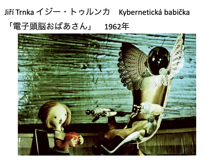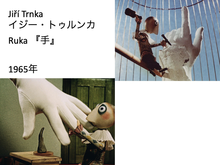 前回の「チェコ人形劇とチェコアニメーションの小史」でも紹介した、チェコアニメの巨匠、Jiří Trnka監督もチェコ・ヌベルバーグの一人になります。彼の『電子頭脳おばあさん』という、ロボットおばあさんの非常に変な近未来の話や、それから同じく65年に、彼の最後の、政府にバンされる映画となる 『Ruka』(手)が発表されます。