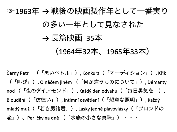 1963年というのは、戦後の映画制作年として、一番実りの多い1年として見なされていて、長編は1年で35本、全てが傑作とみなされていました。『Černý Petr 』(黒いペトル)、『Konkurz』(オーディション)、『Křik』(叫び),『O něčem jiném』(何か違うものについて)、 『Démanty noci』(夜のダイアモンド)、『Každý den odvahu』(毎日勇気を)、『Bloudění』(彷徨い)、『Intimní osvětlení』(懇意な照明)、 『Každý mladý muž』(若き男諸君)、『Lásky jedné plavovlásky』(ブロンドの恋)、『Perličky na dně』(水底の小さな真珠) など傑作作品があります。