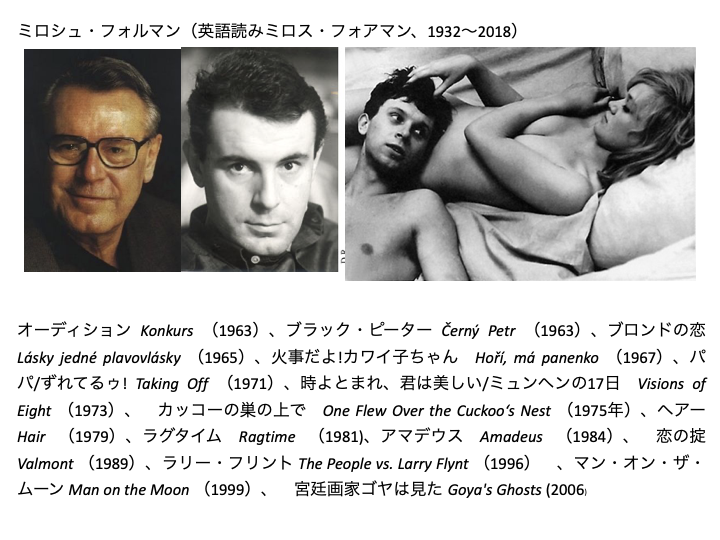 ミロシュ・フォーマンにおいては、アメリカに亡命し、名作を沢山創りました。ジャック・ニコルソンの主役として知られる『One Flew Over the Cuckoo‘s Nest 』(カッコーの巣の上で)や、いわゆるモーツァルトの生涯を描いた『アマデウス』、『HAIR』ですとか 恋の起きてですとか 晩年はラリーフリントですとかMan on the Moon (1999マン・オン・ザ・ムーンとか『The People vs. Larry Flynt 』など素晴らしい作品ばかりです。