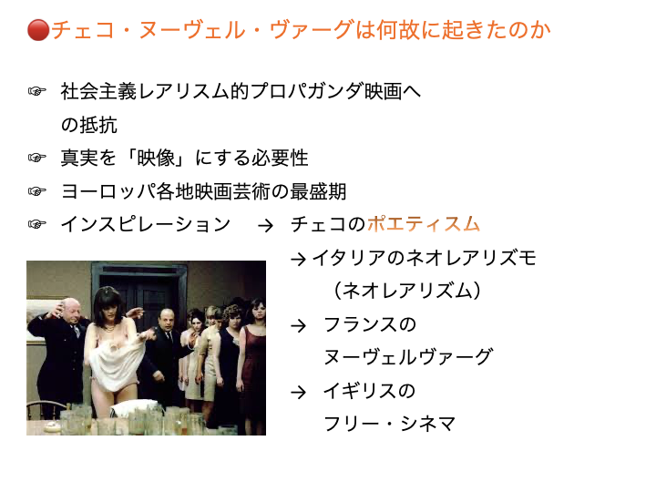 そもそも、チェコ・ヌベルバーグがなぜ起きたのかといと、まずはやはり、プロパガンダ映画への抵抗があったわけです。先ほど申し上げましたように、60年代の初めにロシアのニキタ・クルシチョフという政治家がスターリン主義を批判したわけです。それもあり、プロパガンダ映画の抵抗になり、真実を映像にする必要性を感じたからというふうに言われています。ですので、普通の映画だと“虚構”というのが割と強くて、虚か事実かどっちかわからないのです。しかし、ヌーベルバーグというのは、本当に生の人間をさらけ出すというのがメインの目的だったのです。さらに、それで当時は、すでにフランスやイタリアなど、各地映画芸術の最盛期でもあったということで、インスピレーションとしては、チェコの戦前のポエティスム、イタリアのネオレアリスムです。共産権の国であったチェコスロバキアに、海外からこういう映画が自由に入ってこれた60年代というのは、50年代と違って、非常にオープンになったわけです。しかし、その全てが終わるのは、1968年の旧ソ連の戦車が侵入してからです。