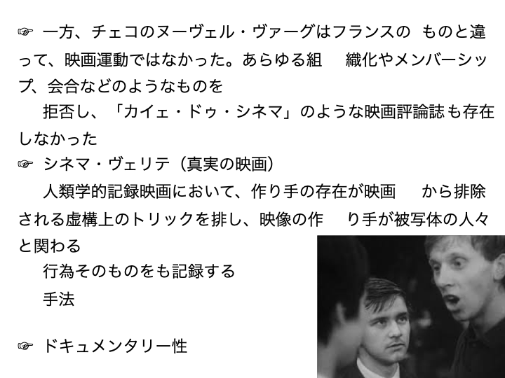 また、チェコのヌーベルバーグの場合は、フランスと違って、映画運動というほど団体での行動ではなかったわけです。 あとは、映像の作り手が、被写体の人々と関わる行為そのものを記録する手法がチェコの映画でも使用されるようになり、映画は一つのドキュメンタリーとしても捉えることができるようになりました。