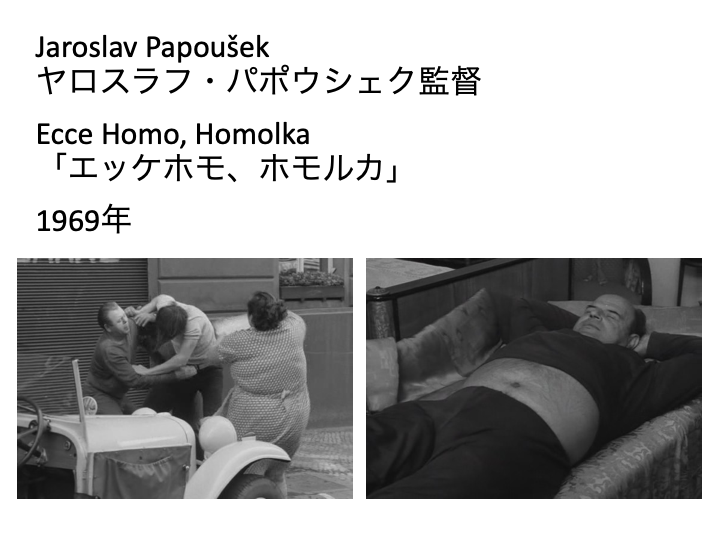 69年の有名な『Ecce Homo, Homolka』は、三部作ですけれども、まさにチェコ社会への通列な批判で、チェコ人の良くない人柄というか、性格の大衆性を見せていて、あまり実は笑っちゃいけないというか、もうどちらかというとちょっと見て辛くなるようなのがあります。また、プロの俳優じゃない、もうドヘタの演技が最高です。