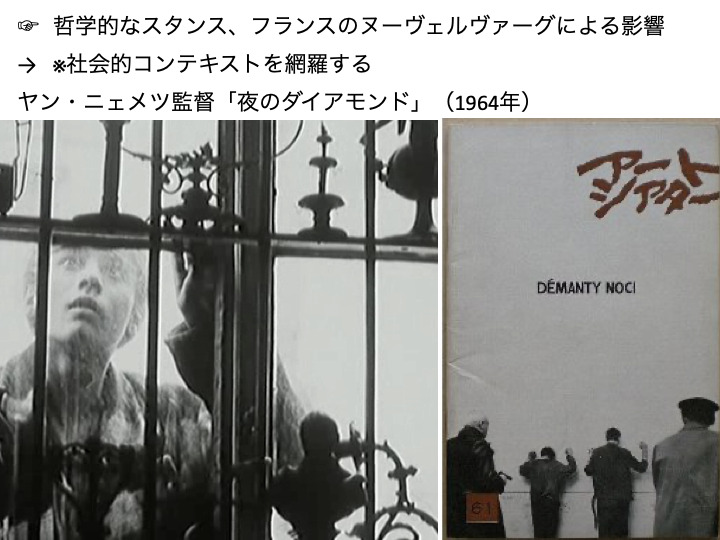 それから、映画がさらに哲学的なスタンスに富んできます。これはフランスのヌーベルワーグによる影響があり、社会的コンテキストを網羅する 作品が非常に多くなってきます。特にこの『Démanty noci』(夜のダイヤモンド)は、戦争とユダヤ人問題を網羅する映画です。