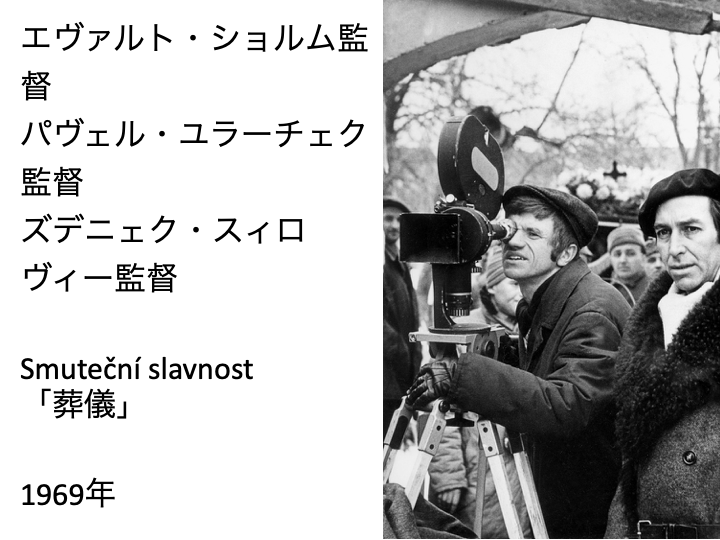 さらに、この『Smuteční slavnost』(葬儀)はエヴァルト・ショルム監督です。このように割と暗いテーマの映画も、全てがやはり社会問題や真面目なテーマを扱っています。こちらは実は68年にソ連の戦車が入ってしまって、撮影されたのはまさにその頃でした。 初上映されたのは69年でしたが、1回の上映でお蔵入りになってしまいました。