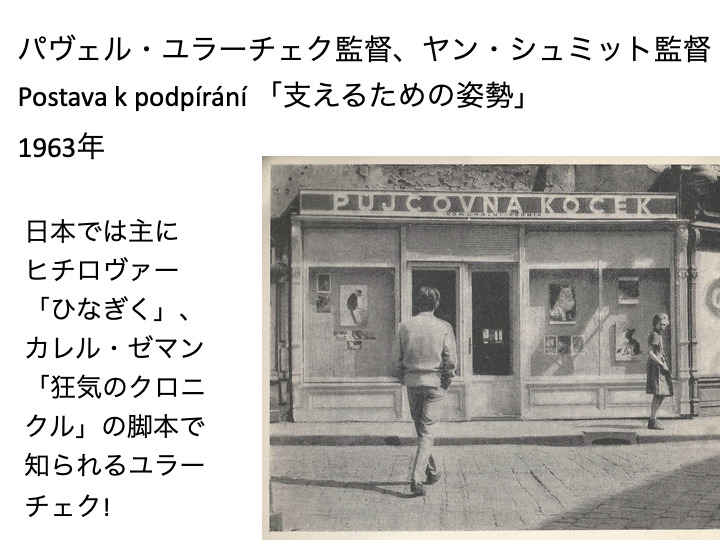 非常に有名な映画を撮っている、パヴェル・ユラーチェ監督とヤン・シミット監督の2人による映画『Postava k podpírání』(支えるための姿勢)という映画があります。2012年の荻上直子の『レンタ猫』も影響されているのでしょうか。これは、とある町に、猫のレンタル屋があり、そこで猫を借り、それを返しに行くと、店ごと無くなっているという、非常に不条理で面白い映画なんです。このユラーチェク、例えばヒチロヴァー監督の『ひなぎく』、アニメーション巨匠のカレル・ゼマンの『狂気のクロニックル』という長編映画の脚本を書いています。