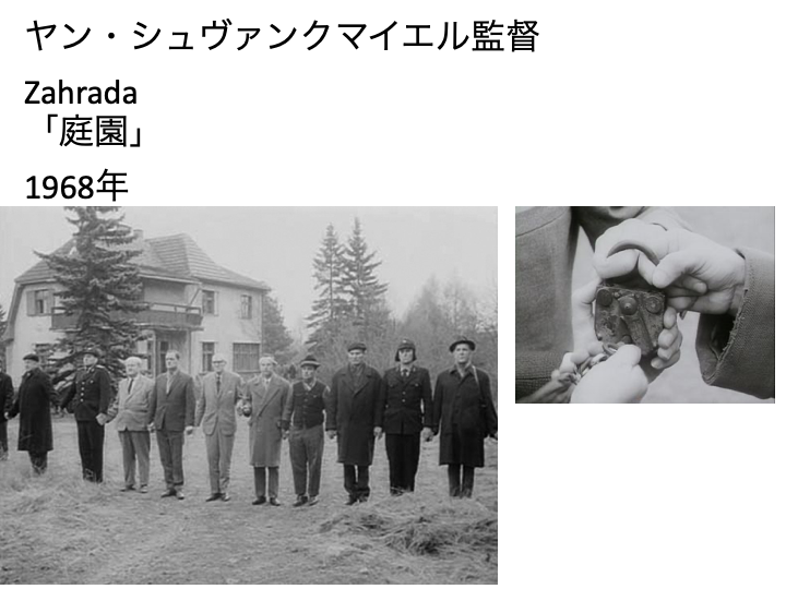 これは、本人はチェコスロバキアヌーベルバーグと関係ないと言っているのですが、ヤン・シュバンクマイエルの『Zahrada』(庭園)という、非常に不条理劇を思えるような短編です。久々に会った二人の同級生が、一人を自分の家に招くわけですけれどもそこに着いたら柵が人間でできているというものです。