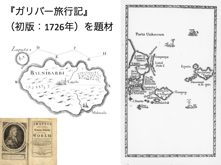 初版は1726年です。皆さんご存じのラピュータやバルニバルディというのは、実は当時の地図でいうと日本の近くにあったという説があるのです。これはもちろん、スビフトの空想なのですけども、 当時の地図を見ると、字が小さいのですが、ここにJAPONと書いてあり、レッソと書いてあるのは北海道のイエソにあたります。
